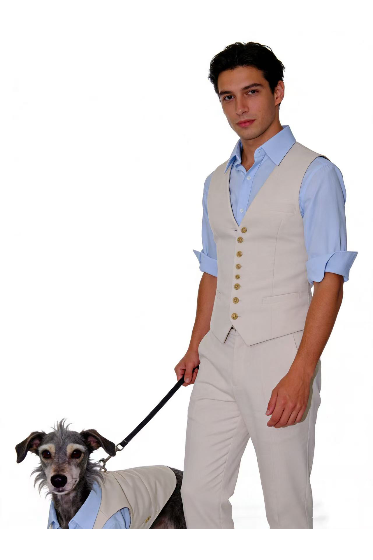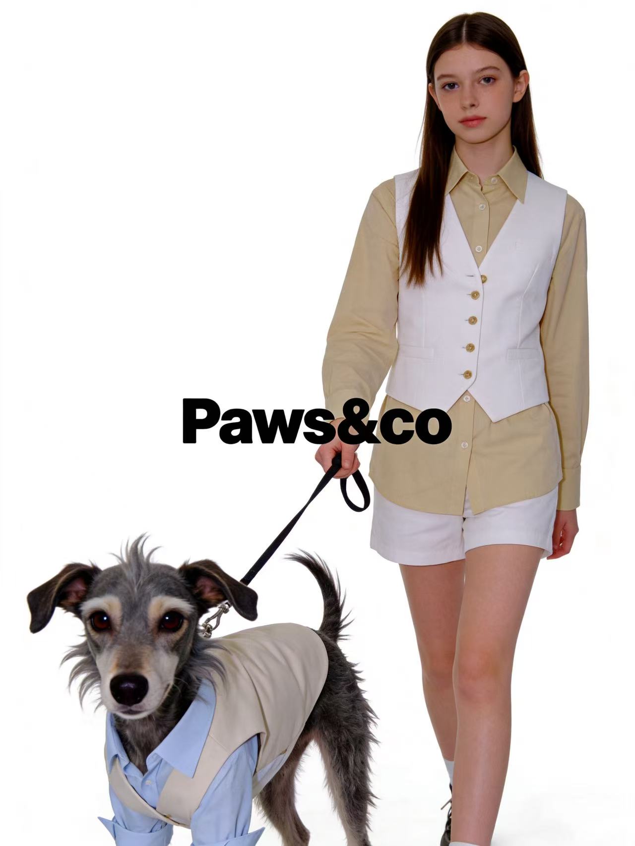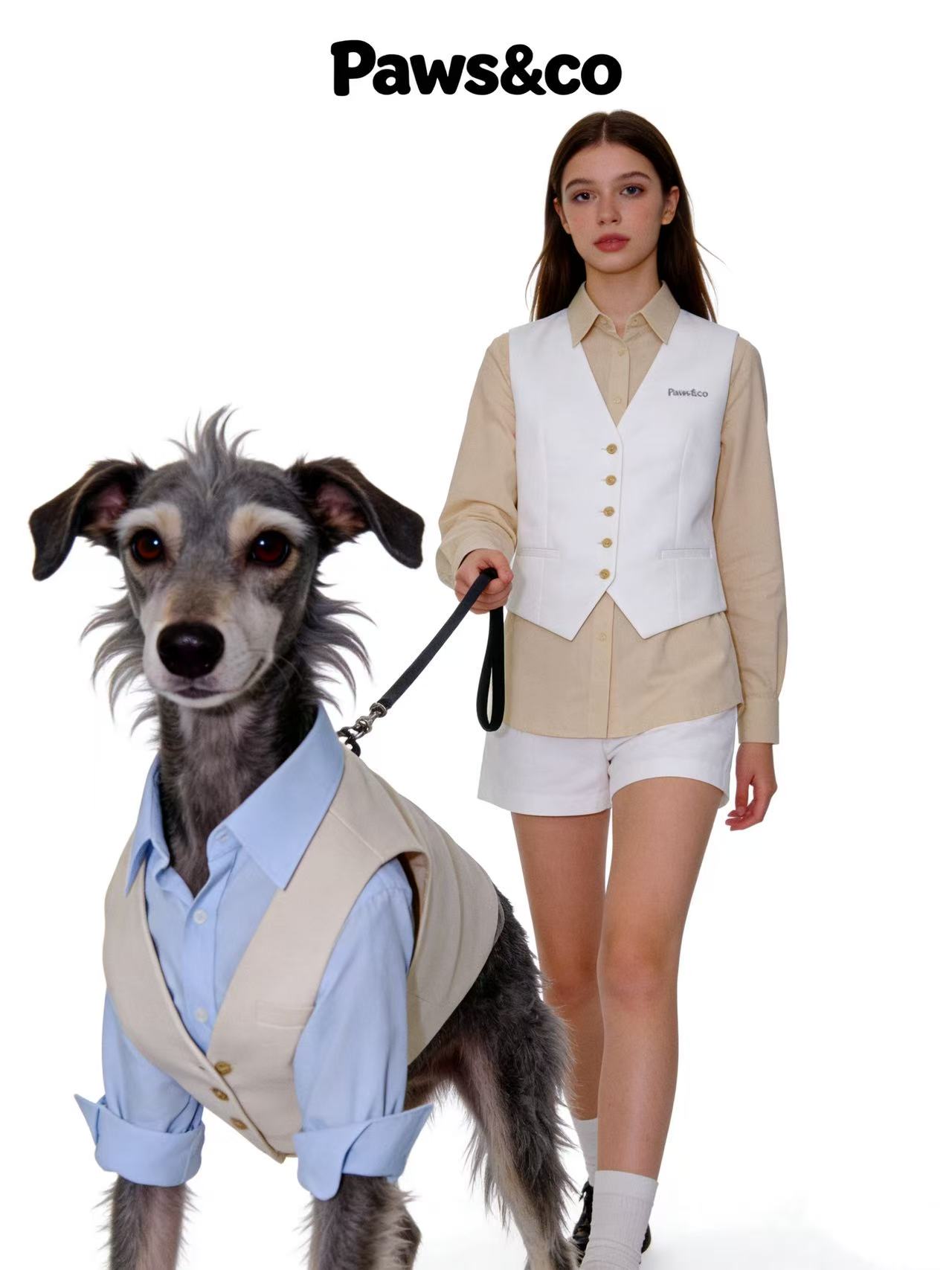 老钱风三件套:马甲+短裤+衬衫。 女款:白马甲短裤+米色衬衫 男款:米色+蓝色套装 狗狗款:米色+蓝色配色 男女同款,尺码 S–6XL。 女士三件套:3499 元($490) 男士三件套:3499 元($490) 狗狗套装:1799 元($252)